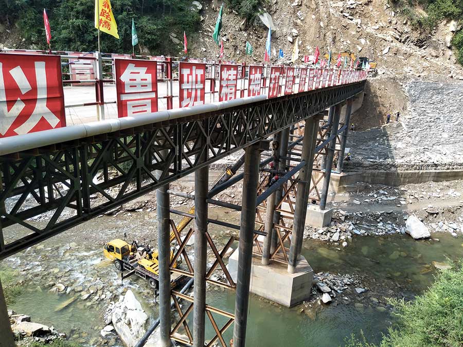 2018年,廣元青川縣遇到了百年一遇的洪水,鋼便橋所處的河道水位也淹沒了整條縣道,該地域已有多座鋼便橋被沖毀。我公司所施工的鋼便橋經(jīng)歷了洪水的洗禮,屹立不倒,為廣平高速正常施工,保證了其重要輸送通道。