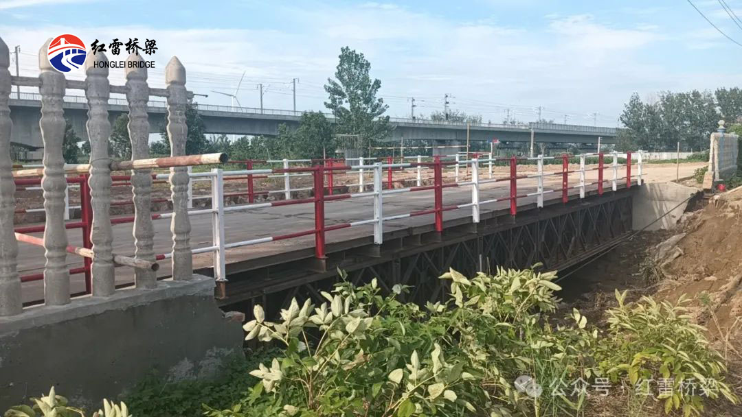紅雷橋梁合作修繕虬龍溝姜樓閘項目,姜樓閘修繕過程中需要截流施工,在原河道旁修建一條導流渠。導流渠的施工導致原有道路截斷,影響了當?shù)鼐用裢ㄐ校t雷橋梁于新建導流渠搭設(shè)鋼便橋一座,用于臨時交通與施工車輛通行。鋼便橋設(shè)計21米一跨過,荷載為80T。由于工期緊,紅雷橋梁以 快地速度做出設(shè)計方案、材料進場、人員施工,確保盡早恢復居民通行。