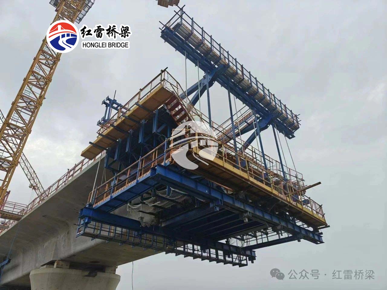 紅雷橋梁合作中鐵八局滬寧合高鐵安徽段站前三標(biāo),時(shí)速350公里高速鐵路無砟軌道預(yù)應(yīng)力混凝土(32+48+32)m雙線連續(xù)梁,主橋上部結(jié)構(gòu)采用(32+48+32)單箱單室等高度箱梁。箱梁懸臂澆注采用菱形掛籃進(jìn)行施工。